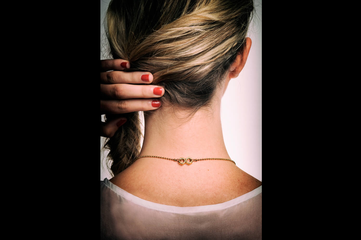 Voor de vrouw die aan de weg timmert, de spijker op z’n kop weet te slaan of de vrouw die geïnspireerd is door ambachten. Het collier is verpakt in een Woeste flacon: verrassend qua vormgeving met een duidelijke Studio Woest uitstraling.
