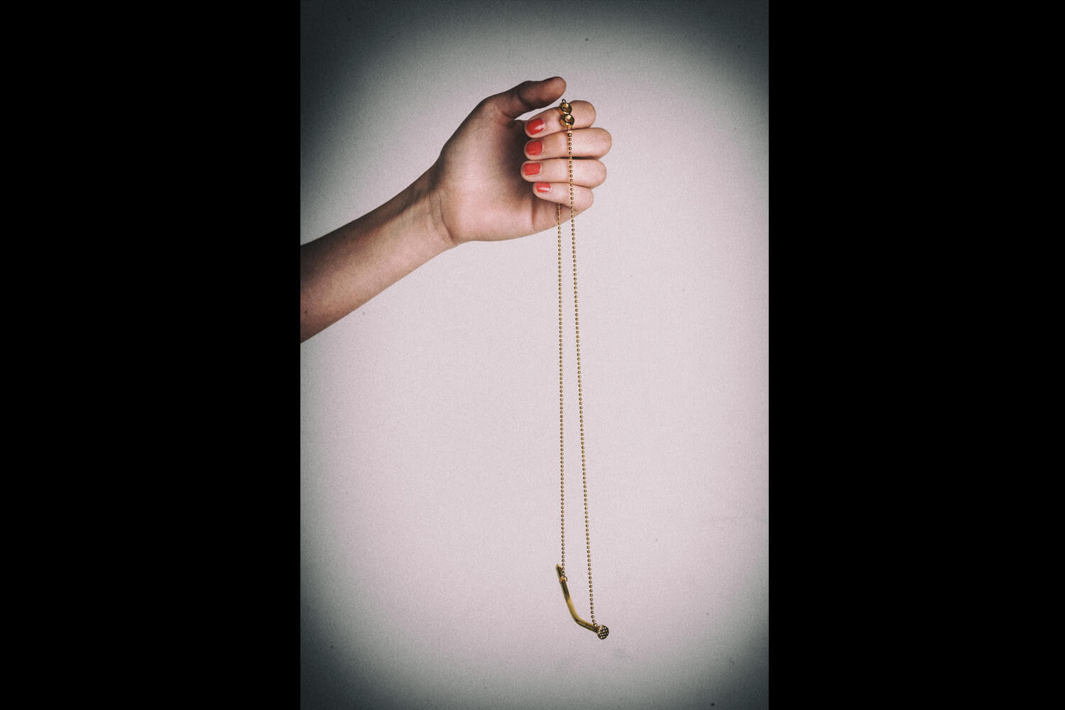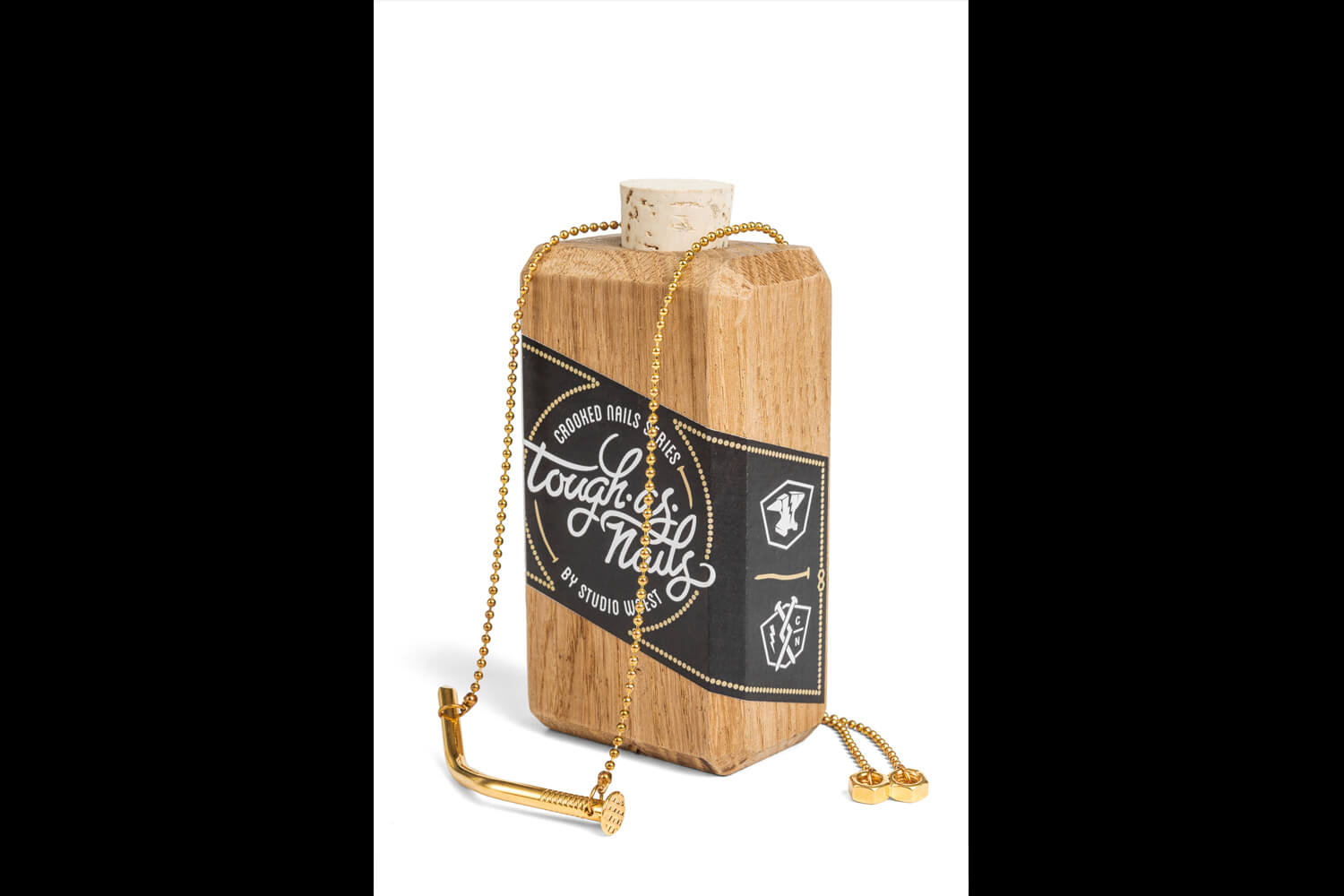 Tough as Nails is een met goud verguld collier met een hanger van een goud vergulde spijker.